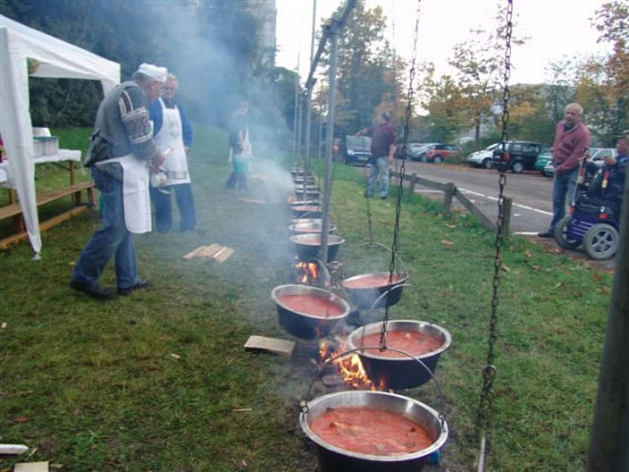 Backnang (kjl) – Wie jedes Jahr im Herbst bot der Vorplatz der Backnanger Stadthalle ein romantisches Bild: veranstaltete der Ortsverband der Landsmannschaft der Donauschwaben doch am 21. Oktober wieder sein traditionelles Fischgulaschessen. Wieder einmal brodelten die Gulaschkessel vor der Backnanger Stadthalle über dem offenen Feuer. Die Männer schwenkten die Kessel gefühlvoll, denn umgerührt werden darf sie auf keinen Fall, die nach traditionellem Rezept hergestellte Fischsuppe.