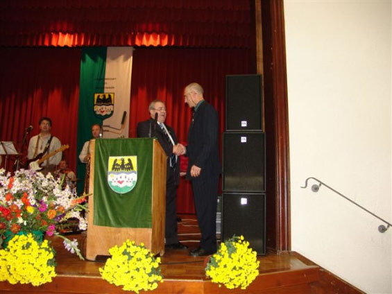 Trotzdem ist es mir ein Bedürfnis Dir einige Ehrengaben zu überreichen und das ist zunächst eine Ehrenurkunde und dann die Prachtausgabe der Geschichte der Donauschwaben und einen Zinnteller mit dem Wappen der Donauschwaben.