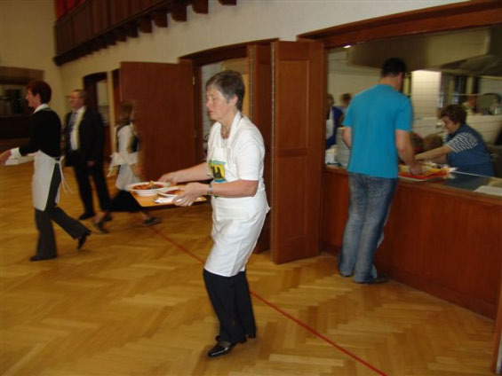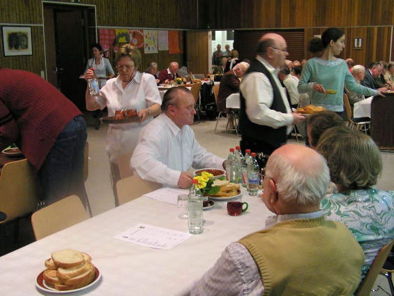 In der Stadthalle warteten die Gäste, bis die vielen Teller hereingetragen wurden. Das donauschwäbische Stammpublikum und alle weiteren Gäste, kosteten kritisch und fanden den Fischgulasch wieder ausgezeichnet.