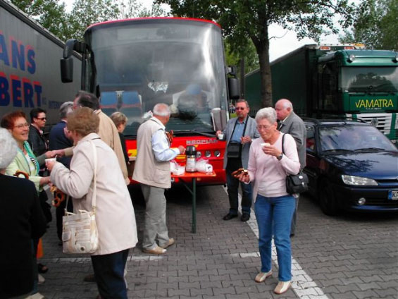 Für einige Sätze meldete sich der Schreiber dieser Zeilen zu Wort. Wenn ich jetzt auf meine Notizzettel schaue wird mir erst richtig bewußt, daß wir recht viel gesehen, gut gegessen und viel erlebt haben. Aber die Vorarbeit von Vorstand Urnauer und Kassier Schnersch war sehr wichtig, obwohl beide nicht an der Reise teilnehmen konnten. Die Feinplanung und die Begleitung über die 4 Reisetage hatte unser 2.Vorsitzender Heinz Kaldi übernommen und sehr souverän durchgeführt. Dafür möchte ich dir lieber Heinz auch im Namen der ganzen Reisegesellschaft ein herzliches Dankeschön aussprechen. Vor allem wünschen wir dir auch eine sich weiter stabilisierende Gesundheit. Die Reise konnte nur so gut gelingen, weil alle zusammen geholfen haben z.B. die frischen Brezeln und die Hausapotheke von Schall Sepp. Nicht zuletzt durch unseren Busfahrer Karl Fischer und seine sichere, Spiegel schonende Fahrweise und seinen guten Kaffee.