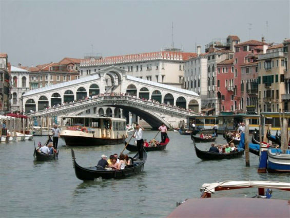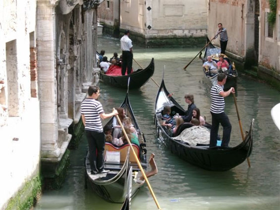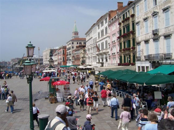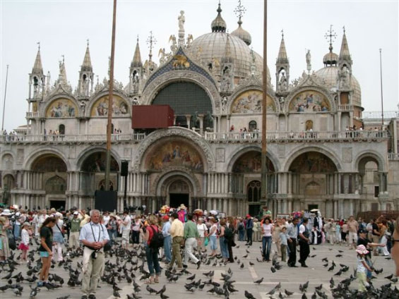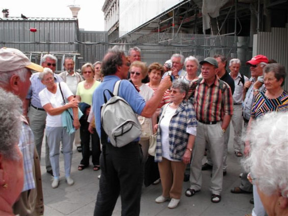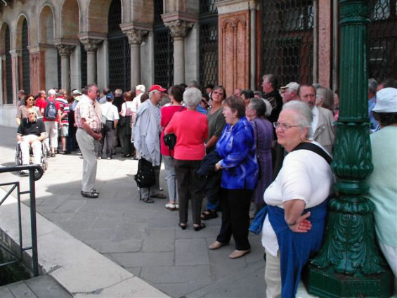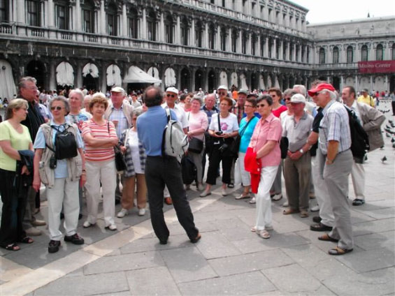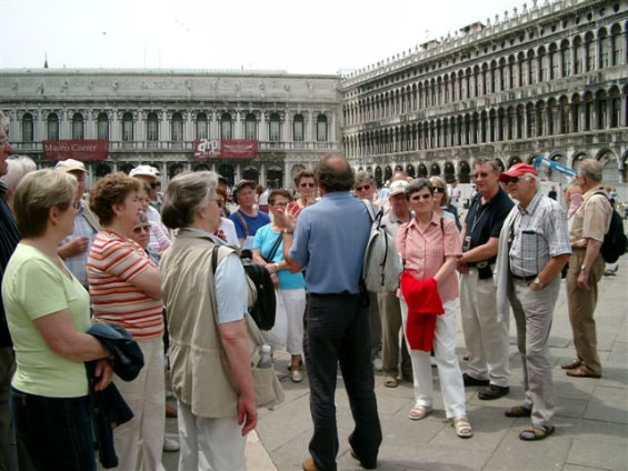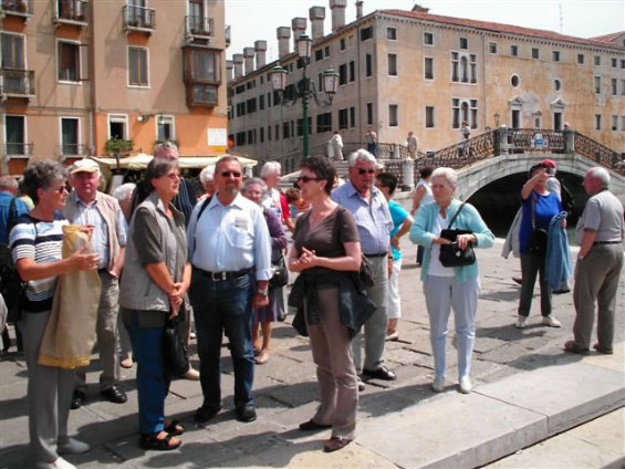 Aus organisatorischen Gründen wurden die Tagesfahrten Venedig und Gardaseerundfahrt getauscht. So brachte uns der Bus heute zunächst an die Schiffsanlegestelle von Venedig. Am Markusplatz angekommen mussten wir feststellen, daß drei Teilnehmer fehlten. Die freie Zeit bis 13Uhr konnte jeder für sich gestalten. Pünktlich zum Führungsbeginn durch einen Reiseführer waren auch die drei Nachzügler wieder dabei. Venedig wurde in seiner 2000 - jährigen Geschichte nur ein einziges mal erobert und zwar von Napoleon. Die ersten Siedler in der Lagune waren süditalienische Flüchtlinge. Sie gründeten auf den Inseln rund 160 Dörfer. Jedes Dorf hatte eine eigene Kirche. Im Laufe der Jahrhunderte wuchsen die Dörfer zu Venedig zusammen. Deshalb hat die Stadt heute noch etwa 110 Kirchen. Zwischen den Inseln wurden die Wasserstraßen belassen und jede Brücke führt praktisch auf eine andere Insel.