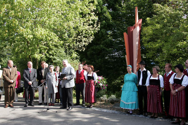 Für die Stadt Backnang überbrachte Stadträtin Ursula Hefter-Hövelborn Grüße. Sie erinnerte daran, dass der Standort des Mahnmals kein Zufall sei, schließlich habe genau dort das Barackenlager gestanden, in dem zahlreiche Heimatvertriebene bei ihrer Ankunft in Backnang eine erste Bleibe gefunden haben. Sich heute die dort herrschende Not und das Elend vorzustellen, sei aus der Sicht der heutigen Wohlstandsgesellschaft schwierig. Als prominenter Zeitzeuge habe aber erst kürzlich Bundespräsident Horst Köhler daran erinnert, wie er als zehnjähriger Junge diese Zeit in Backnang erlebt habe. Inzwischen erinnere eine Gedenktafel an den Aufenthalt im zum Flüchtlingslager umgenutzten ehemaligen Lehrerseminar. Das Zusammenleben sei am Anfang nicht unproblematisch gewesen, so Hefter-Hövelborn. Umso beachtlicher sei die Leistung, dass zwölf Millionen Menschen erfolgreich integriert werden konnte. „Darauf können wir stolz sein,“ dies habe Bundespräsident Köhler in seiner Botschaft zum Tag der Heimat betont. Stadträtin Hefter-Hövelborn ergänzte dazu, dass in Backnang zahlreiche Straßennamen an die erfolgreiche Integration erinnern. Außerdem nannte sie die Städtepartnerschaft mit der ungarischen Stadt Bácsalmás, die aus der Patenschaft über die heimatvertriebenen Deutschen aus Bácsalmás erwachsen sei. Die Veranstaltungen der Heimatvertriebenen die Stadt Backnang. Dazu sei etwa das Bácsalmáser Heimattreffen zu zählen, das bald zum 50. Mal stattfinden werde.