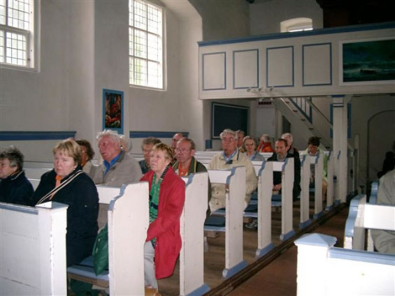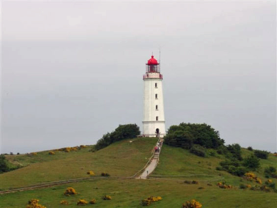 Am nächsten Tag stand die Besichtigung der autofreien Insel Hiddensee, ein Eiland von einzigartiger Lieblichkeit, auf unserem Programm. Mit einem Schiff wurden wir von Scharprode nach Kloster gebracht. Wir besichtigten dort die älteste Inselkirche und den Friedhof mit dem Grab des Dichters Gerhard Hauptmann. Entlang der Dorfstraße mit Einkaufsmöglichkeiten, einer Bernsteinschleiferei, einer alten Dorfbäckerei schlenderten wir vorbei am Haus von Gerhard Hauptmann (jetzt Museum) bis zur Ostsee, wo wir Steine sammeln konnten. An den Rändern wachsen weiß und pinkfarbig blühende wilde Heckenrosen. Wer wollte konnte dann an einer Wanderung zum Leuchtturm ins „Hochland“ von Hiddensee teilnehmen und die herrliche Vegetation betrachten. Die Hänge waren mit blühenden gelben Ginsterbüschen überzogen. Im Herbst leuchten dann die Früchte des Sanddorns, den man überall auf den Inseln findet. Mit dem Kremser ging es per Pferdewagen durch die blühenden Salzwiesen und den Beginn der Heide nach Vitte. Die MS „Vitte“ brachte uns nach Scharprode zurück. Am Abend wurde uns noch eine Boddenwanderung angeboten.