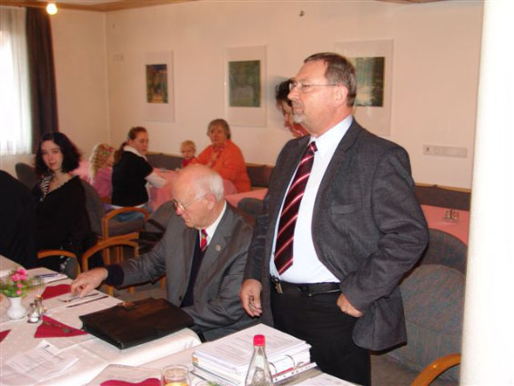 Der anwesende Kreisvorsitzende RichardHarle richtete dann ein Grußwort an die Mitglieder. Er überbrachte den Dank des Bundesvorsitzenden Supritz für die aktive und vorbildliche Arbeit des Backnanger Ortsverbandes. Er appellierte auch, daran zu arbeiten, dass das Schicksal der Donauschwaben nicht in Vergessenheit gerate. Denn ein altes Sprichwort besage: "Wer schreibt, der bleibt." Und wenn dies mit modernen Kommunikations- und Vervielfältigungsmöglichkeiten geschehe könne auch die jüngere Generation mehr damit anfangen. Es gelte Traditionen zu bewahren und gleichzeitig die Zukunft modern zu gestalten. Was in Bayern "Laptop und Lederhose" heiße müsse für die Zukunft der Donauschwaben "Bratwürste und Computer" bedeuten.