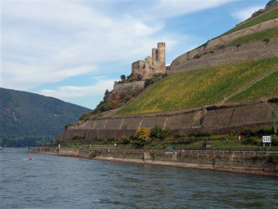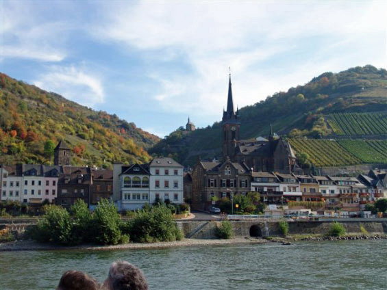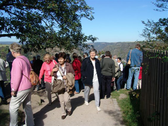 Bei herrlichem Sonnenschein brachte uns das Schiff durch das schöne Rheintal inmitten von Reben und sich schon bunt färbenden Wäldern mit rechts und links auf den Anhöhen liegenden Burgen und Ruinen, vorbei an Niederheimbach (der Urheimat der Auswandererfamilie Weißbarth), Bacharach, Oberwesel, dem Loreleyfelsen nach St. Goarshausen. Dort erwartete uns wieder der Bus, um uns auf die Aussichtsplattform des Loreleyfelsens zu bringen. Eine herrliche Rundumsicht belohnte uns.