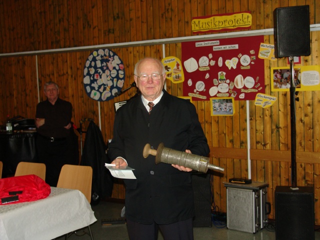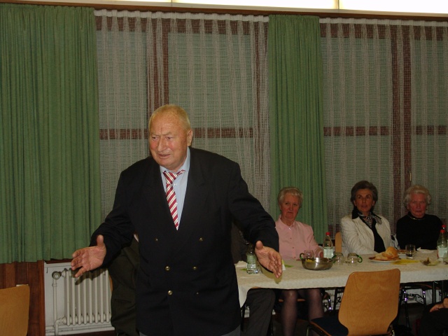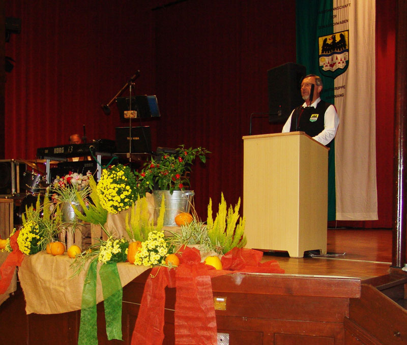 Der erste Vorsitzende, Heinz Kaldi, begrüßte die Gäste, die sich trotz des schlechten Wetters eingefunden hatten. Ganz besondere Willkommensgrüße richtete er an den Vertreter des Oberbürgermeisters der Stadt Backnang, Herrn Alfred Bauer, Herrn Dr. Ketterer von der CDU-Fraktion, Stadträtin Charlotte Klinghoffer und den Hausherrn, Herrn Pfarrer Pfarrer Kloos. Auch den Vorsitzenden des Kreisverbandes der Donauschwaben, Herrn Richard Harle mit seiner Gattin, konnte er begrüßen. Wieder hatte er eine Überraschung in seinem Gepäck.