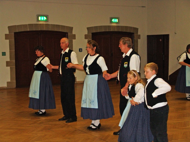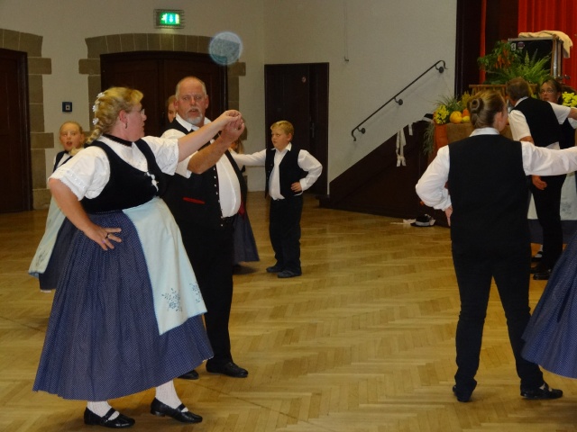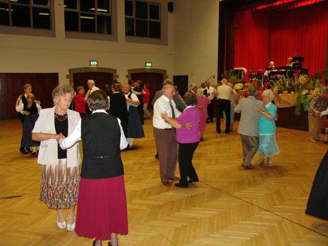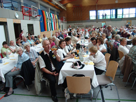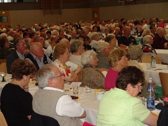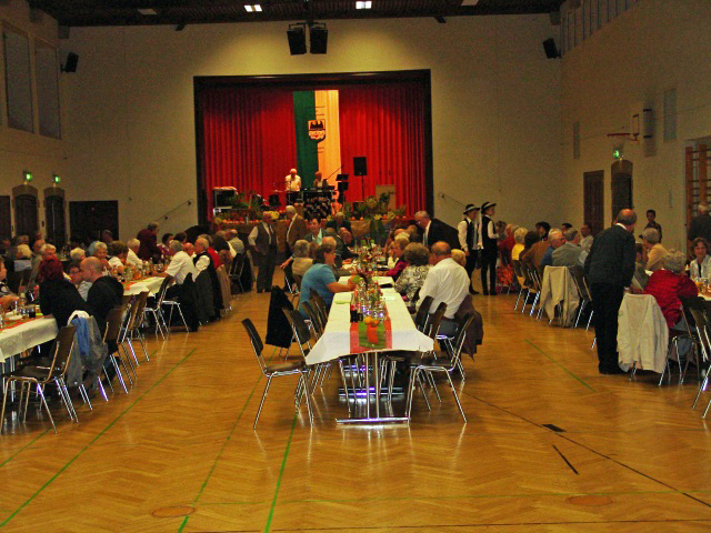 Nach dem Mittagessen im Bärenkeller ging es mit dem Bus zur Unstrut Halle nach Sömmerda. Ein buntes abwechslungsreiches Programm erfreute die zahlreich erschienenen Gäste in der festlich geschmückten Halle. Unter den Klängen des Prinz-Eugen-Marsches zogen alle Trachtenträger ein. Die Tanzgruppe Backnang eröffnete das Programm, Männerchor und Singkreis im Wechsel mit der Donauschwäbischen Tanzgruppe Mosbach und der Ungarndeutschen Tanzgruppe aus Babarc/Ungarn gestalteten den Nachmittag. Die Residenzstadtkapelle Gehren sorgte für die musikalische Unterhaltung.