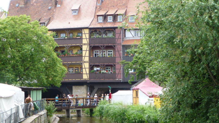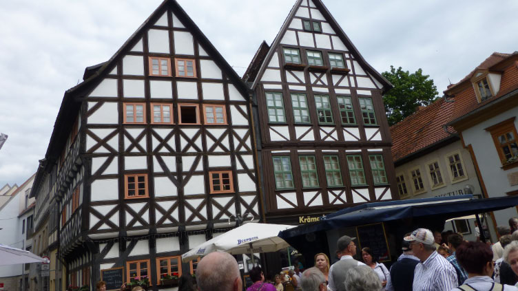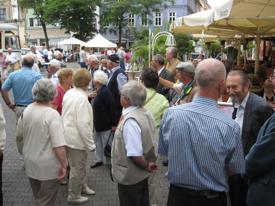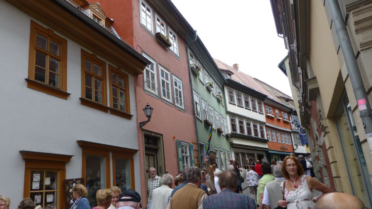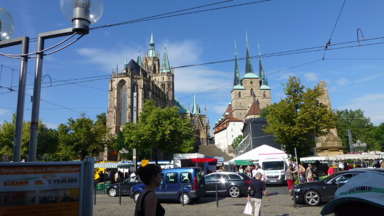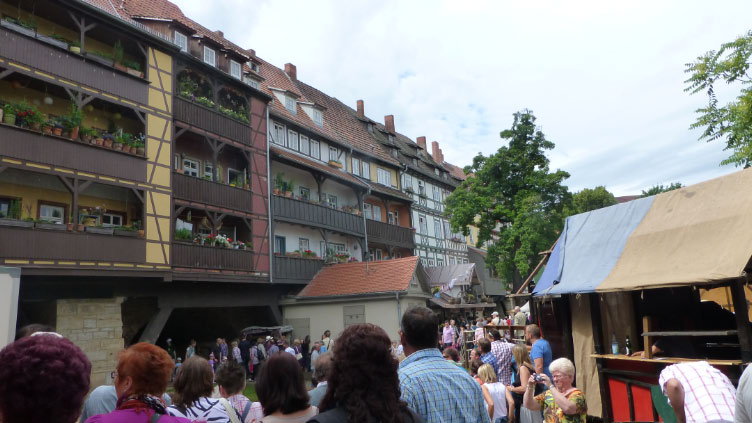 Die Gruppe erreichte am Freitagabend nach hohem Verkehrsaufkommen etwas verspätet das Hotel in Erfurt. Am Samstagvormittag erwartete eine Stadtführung durch Erfurt mit der historischen Stadtbahn die Teilnehmer. Die Hauptsehenswürdigkeiten der thüringischen Landeshauptstadt Erfurt sind die Kathedrale Erfurter Dom und die Krämerbrücke, eine 120 m lange komplett mit 32 Häusern bebaute und bewohnte Brücke, die den Fluss Gera überspannt. Darüber hinaus besitzt die Stadt einen mittelalterlich geprägten Altstadtkern. Gerade an diesem Wochenende fand das größte Altstadtfest Thüringens, das Krämerbrückenfest, mit einem traditionell gestalteten Mittelaltermarkt statt. Straßentheater, Künstler und Gaukler erfüllten mit Musik, Kleinkunst und Spielen die Gassen und Plätze.