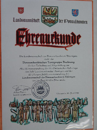 Beim diesjährigen Jahresausflug begleiteten die Backnanger Donauschwaben ihre donauschwäbische Tanzgruppe zur Abschlussveranstaltung der 20. Ostdeutschen Kulturtage des BdV Landesverband Thüringen und zum 20-jährigen Bestehen der Landsmannschaft der Donauschwaben Landesverband Thüringen, die am Samstag, 16. Juni, in Sömmerda bei Erfurt stattfand.