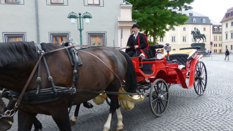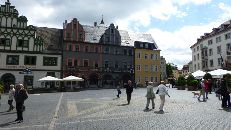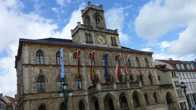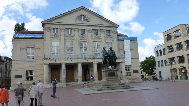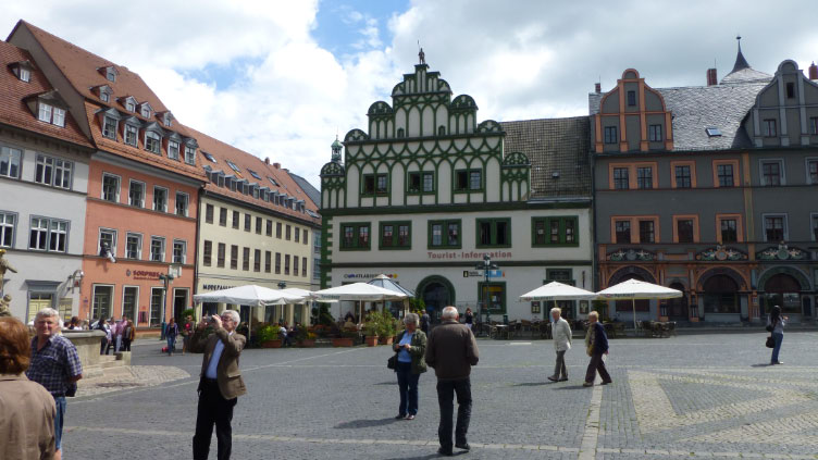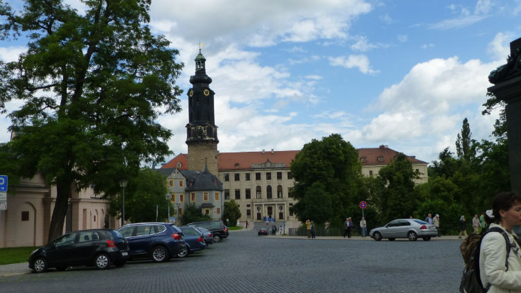 Am Sonntag ging die Reise nach Weimar. Zu Fuß führte uns der Reiseführer durch die beschauliche Stadt vorbei an der Bauhaus-Universität, der Herzog Anna Amalia Bibliothek, dem Stadtschloss, dem Deutschen Nationalmuseum und den Wohnhäusern von Goethe und Schiller. Neben den großen Dichtern Goethe, Schiller, Wieland und Herder sind als kulturelles Erbe auch das Bauhaus und 1919 die Gründung der Weimarer Republik zu nennen.