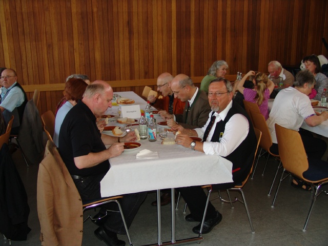 Die Landsmannschaft habe sich den Gegebenheiten der Zeit angepasst und für die älteren Mitglieder das Gulaschessen von den Abendstunden an einem Samstag auf den Sonntagmittag, 25. März 2012 verlegt, was die Vorteile habe, dass kein Mittagessen gekocht werden muss, etwas mehr Unabhängigkeit vom Wetter bestehe und alle noch bei Tageslicht nach Hause kommen. Weiterhin wurde dieses Jahr versucht, neben dem Lammgulasch auch ein von der alten Heimat überliefertes Hinkelgulasch anstelle dem gemischten Gulasch zuzubereiten und zu servieren. Diese Umstellungen wurden von den Besuchern gut angenommen. Er bedankte sich bei den vielen fleißigen Helfern, die bei den Vorarbeiten und bei der Zubereitung des leckeren Essens in der Küche mitgewirkt haben, was mit einem kräftigen Applaus bestätigt wurde.