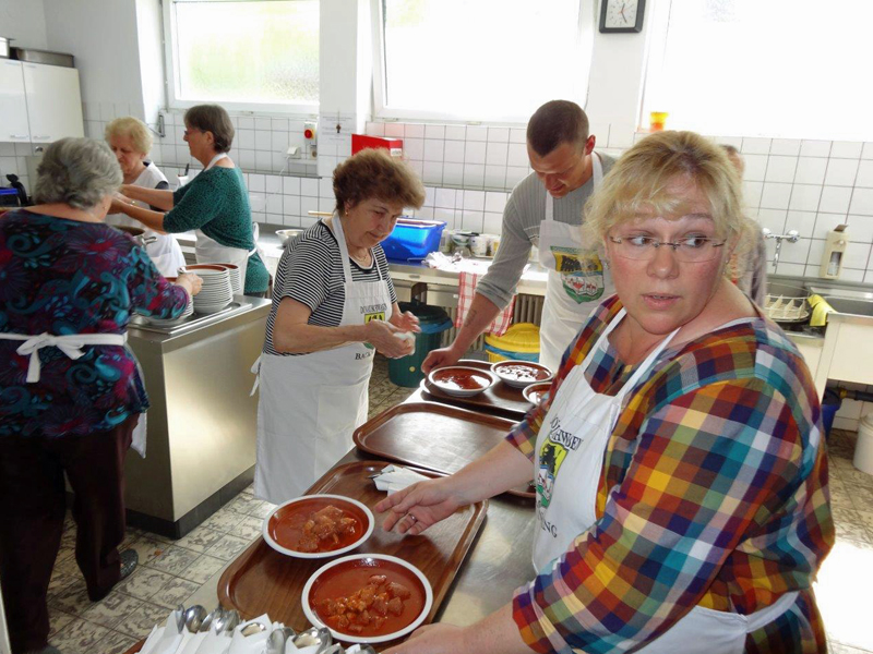 Dieses Jahr wurden 120 kg Fleisch zu Bratwürsten nach donauschwäbischem Rezept verarbeitet. Das eingespielte Küchenteam hat das Essen mit Meerrettich und Kartoffelsalat wieder bestens zubereitet. Der ganzen Helferschar wurde mit einem Applaus für den unermüdlichen Einsatz gedankt.