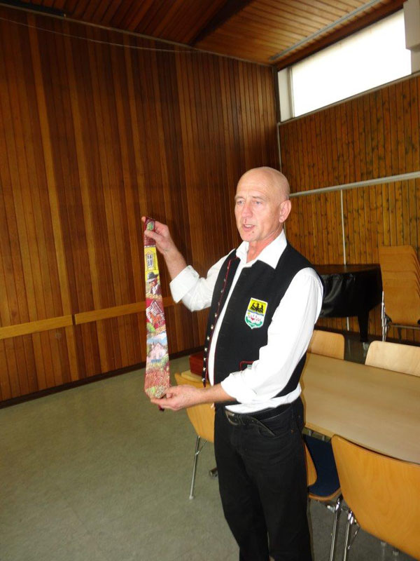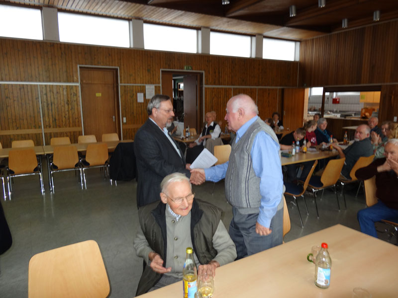 Verabschiedung von Josef Schall aus dem Vorstand Josef Schall gehörte dem Vorstand seit seinem Vereinsbeitritt 1964 an, das sind 52 Jahre. Zu seinen Aufgaben gehörte der wirtschaftliche Bereich, wie Wareneinkauf von Fleisch für Essen und Bratwurstmachen, Getränke, die Utensilien für den Kaffee und die Küche. Beim Bratwurstmachen war er zuständig für die Leitung der Gruppe und das Rezept der Wurstherstellung. Die Gewürzmischung wird er auch weiterhin vorbereiten. Wir wollen ihm für diese über 50-jährige Vorstandsarbeit unseren besten Dank aussprechen und mit diesem Dank auch ein Gebinde von 12 Flaschen eines ausgezeichneten Tropfen Weines überreichen.
