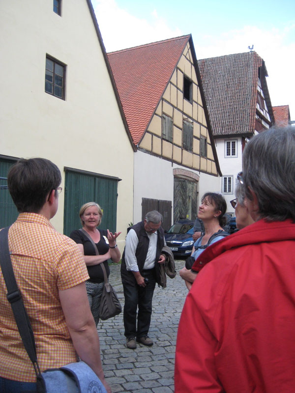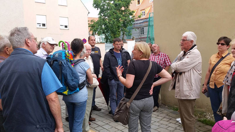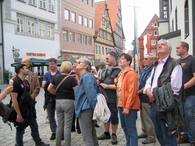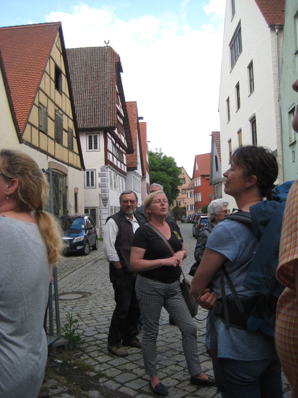 1215 erhielt Nördlingen von Kaiser Friedrich II. Stadtrechte und wurde Reichsstadt. In jenem Jahr wurde die erste Stadtmauer errichtet, deren Grundriss bis heute sichtbar ist. 1219 wurde die Nördlinger Pfingstmesse das erste Mal urkundlich erwähnt. Die Stadt, an der Kreuzung zweier großer Handelsstraßen (Frankfurt/Würzburg–Augsburg und Nürnberg–Ulm) gelegen, stieg zum wichtigen Handelsplatz für Getreide, Vieh, Textilien, Pelze und Metallwaren auf. Neben Frankfurt war Nördlingen eine der wichtigsten Fernhandelsmessen Deutschlands. Dies berichtete unsere Stadtführerin beim Betreten der Altstadt durch die Stadtmauer am Löpsinger Tor (eines von 5 Toren). Das Löpsinger Tor sicherte früher den Straßenzugang nach Nürnberg und Leipzig und beherbergt heute auf sechs Ebenen das Stadtmauermuseum. Unser Rundgang durch die historische Altstadt von Nördlingen führte uns vorbei an der gut erhaltenen Stadtmauer, liebevoll renovierten Gerberhäusern, dem Hafenmarkt, dem international bedeutsamen Rieskrater-Museum, der Spitalanlage und Spitalkirche, dem Kirchturm "Daniel", der St.-Georgs-Kirche, dem Rathaus, dem Leihhaus, dem Brot- und Tanzhaus. Nach einem erfrischenden Eis ging es wieder zurück zum Bus um die Heimreise nach Backnang anzutreten.
