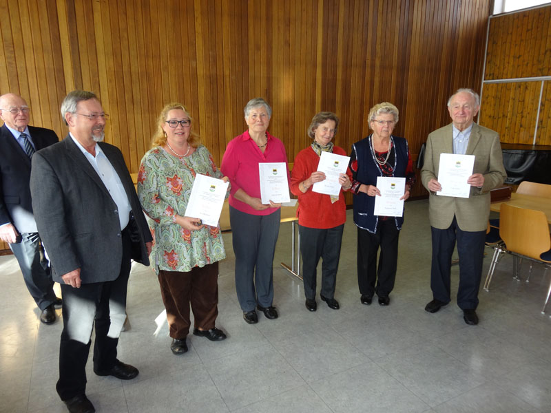 von links nach rechts: Richard Harle, Kreisvorsitzender, Heinz Kaldi, 1. Vorsitzender, Eva Biederer, Elfriede Seiler, Rosina Ziegler, Katharina Tasch und Adam Heim