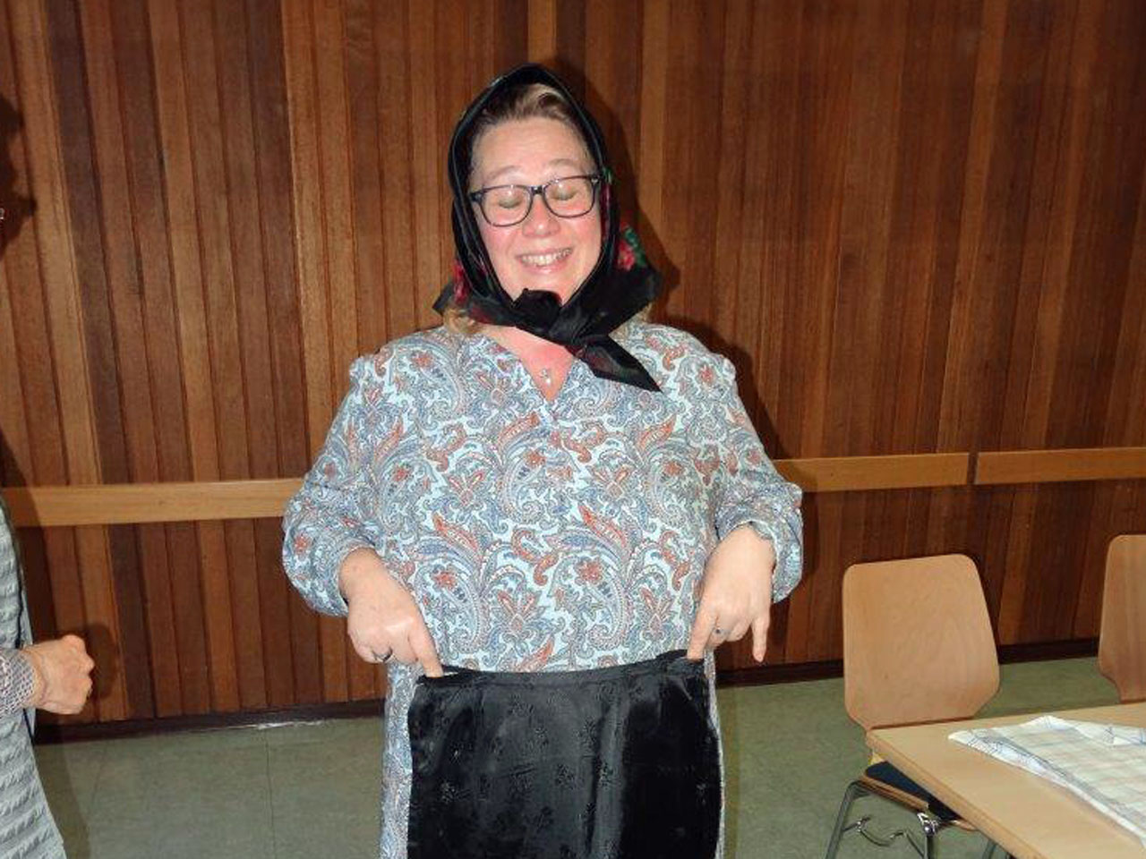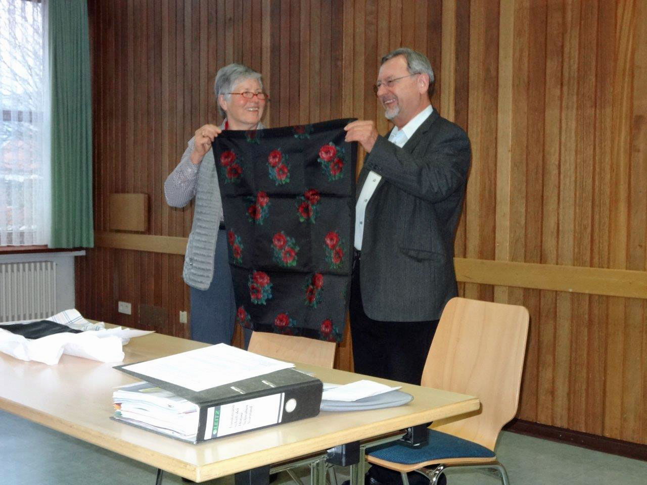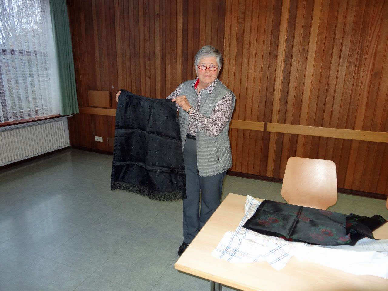 Am Ende der Mitgliederversammlung wurde den Anwesenden ein originales Braut-Kopftuch und eine schwarz-seidene Schürze gezeigt, die das Ehepaar Josef und Rosalia Weißbarth von der Tochter ihrer einstigen Arbeiterfamilie in Weprowatz vor über 30 Jahren zur Verwahrung überlassen bekamen. Die Eheleute möchten beide Kleidungsstücke nun dem Ortsverband Backnang übergeben, um diese in das Zentralmuseum nach Ulm zu geben.