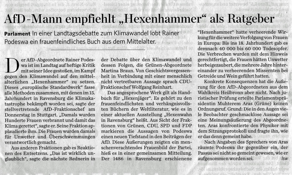 AFD Abgeordneter empfiehlt "Hexenhammer" als Ratgeber der Klimapolitik: Stuttgarter Zeitung vom 12.05.2017 Video der Plenarsitzung - Redebeitrag von 36:00 bis 38:30 Dr. Rainer Podeswa analysierte die Nachweise des Klimawandels